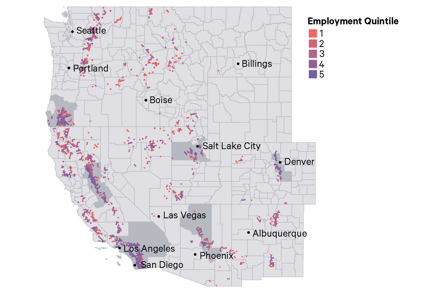 Figure 2. Employment Quintile Mapped on Areas of Very High Wildfire Hazard Among Western US States