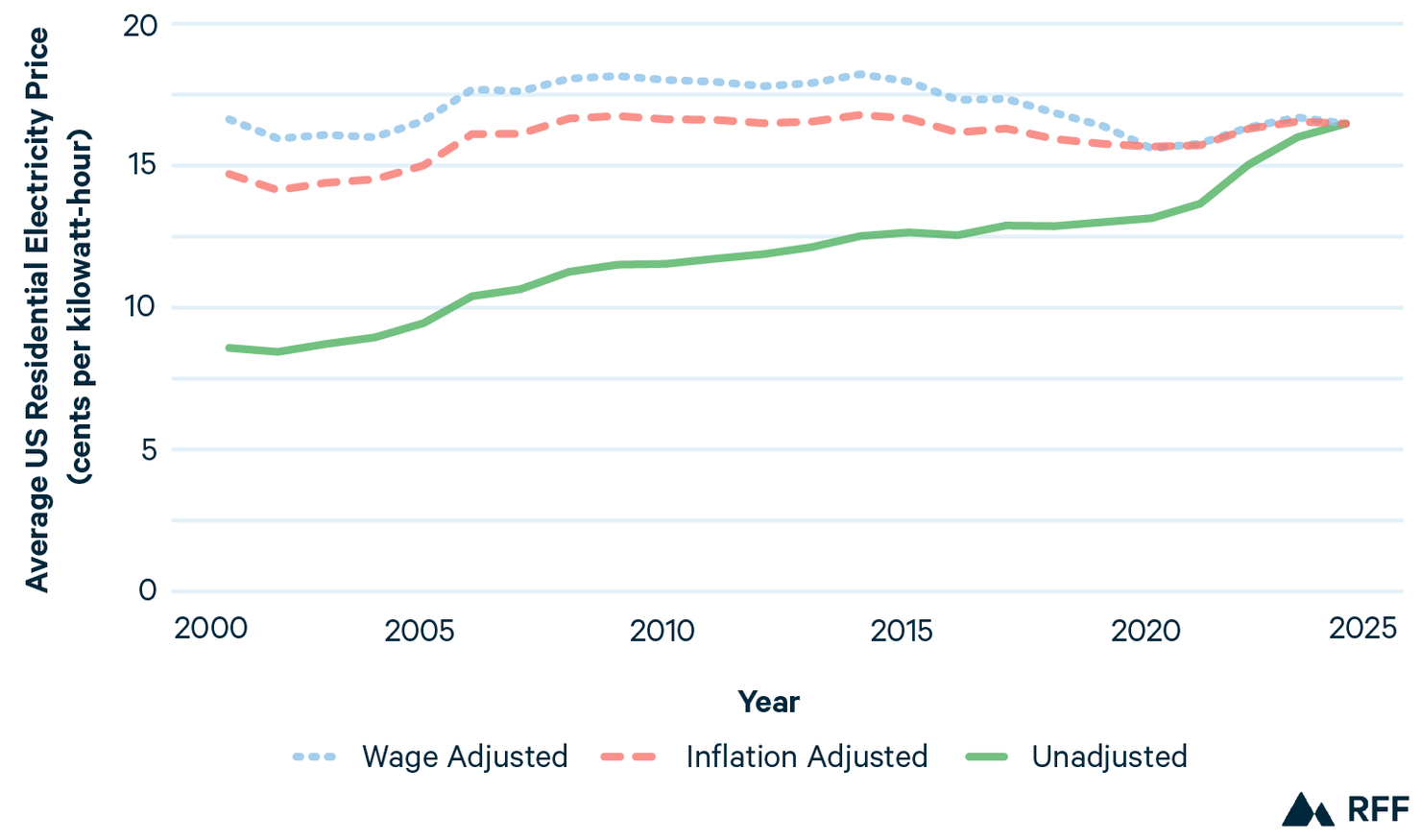 In this article, we explore recent trends in average residential electricity prices and some underlying causes of the changes that we see. We use data sets (many accessed through the Public Utility Data Liberation Project) from the US Energy Information Administration, the Bureau of Labor Statistics, and the Federal Energy Regulatory Commission. These data document how US electricity prices have changed from 2001 to 2024, how resulting costs have changed, and the various components of costs. Collectively, analyzing these data help us explore some of the underlying causes of changes in electricity prices. Note that certain data series have data available only through 2023. In all charts, we show all available data.