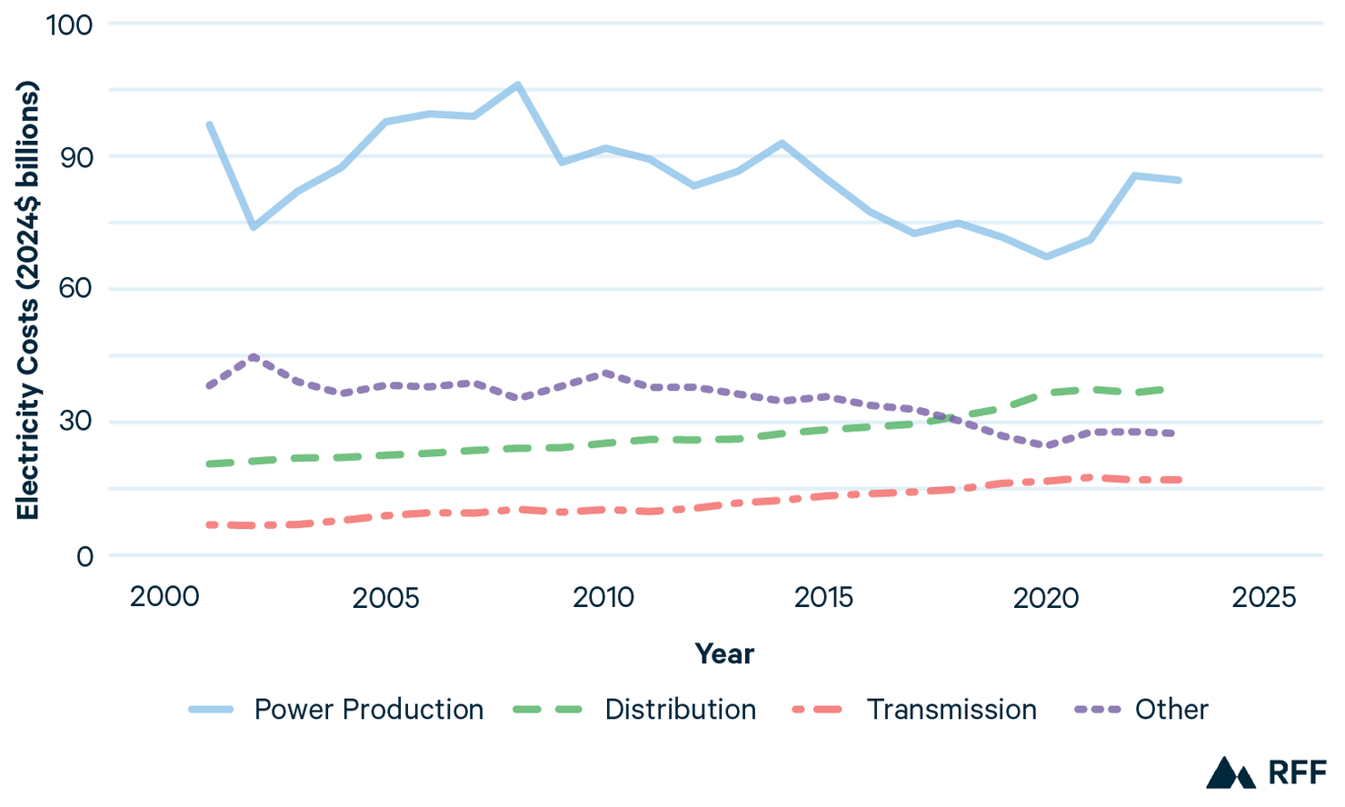 The uptick in costs around 2021 primarily comes from power production, seemingly from the costs of natural gas generation in particular. From 2020 to 2022, a stark increase in the costs of power production aligned with a period of high global natural gas prices during the first years of the Russia-Ukraine war. However, the longer-term trend is a reduction in the costs of power production, as real natural gas prices generally have been decreasing since the boom in hydraulic fracturing methods to extract natural gas around 2010 and as new renewable generation has reduced fuel expenses. Although we do not have complete 2024 data, natural gas prices returned to roughly pre-conflict levels by 2024, and the data available indicate that power production costs decreased commensurately, suggesting that natural gas prices are a temporary driver of high electricity prices.