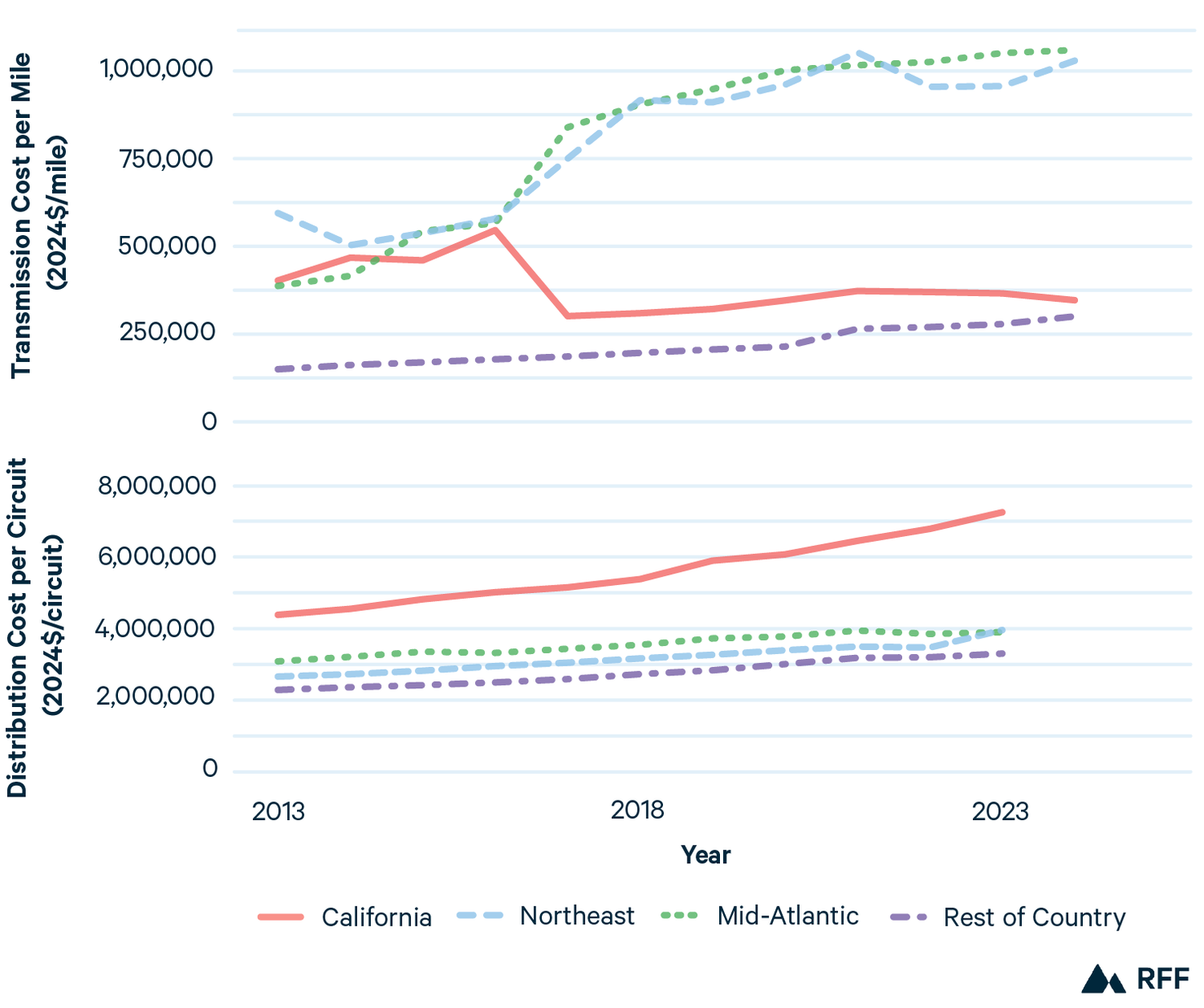 Chart 5: Transmission Cost per Mile and Distribution Cost per Circuit by Region, 2013–2024