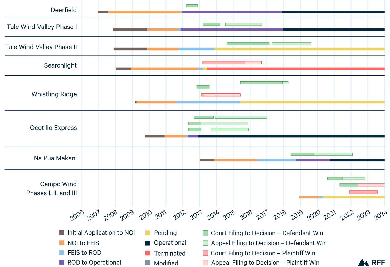 Though the defendants prevailed in most cases, court challenges caused or contributed to the termination of three projects, and six additional projects experienced significant delays as developers waited for final court decisions (Figure 2). However, a comparison of our timelines reveals that, when terminated projects are excluded, the wind and solar projects that faced court challenges had similar average project development timelines to the wind and solar projects without court challenges following the completion of NEPA review.