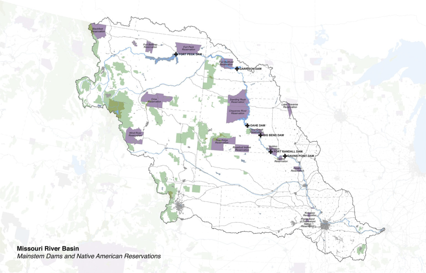 Dams coincide with Native American reservations in multiple locations along the Upper Missouri River. “The Army Corps of Engineers was picking locations not necessarily based on how sound they were for engineering purposes. They were choosing these locations for dams based on who had the least political power and the least political sway,” says University of Denver Assistant Professor Angela Parker on this week’s episode of Resources Radio. “Basically, any time that the Missouri River crosses through an Indian reservation, you will see an Army Corps of Engineers dam.” Parker, an enrolled member of the Mandan, Hidatsa, and Cree Tribes, explains the cultural and ecological importance of the river to Native communities, the historical migration of these communities northward along its banks, and how dams on the Missouri River displaced Tribes and disrupted their livelihoods. This map highlights the locations of Native reservations (in purple) relative to the locations of federal dams.