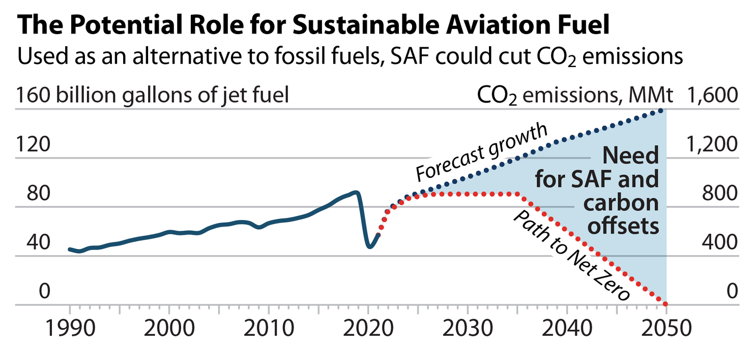 Sustainable aviation fuels (SAFs) offer an alternative to conventional jet fuels that can help reduce the climate impact of the aviation sector, which is expected to continue to grow after briefly contracting during the pandemic. This Chart of the Week highlights projected growth in demand for conventional jet fuels and carbon dioxide emissions, with global consumption of jet fuels expected to increase through 2050. Without intervention, emissions are expected to reach 1,600 million metric tons per year. Significant emissions reductions, which could be achieved with the adoption of SAFs and the use of carbon offsets, will be necessary to achieve net zero in the aviation industry.