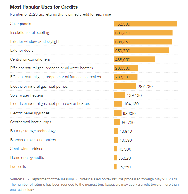 Americans increasingly are taking advantage of clean energy tax credits under the Inflation Reduction Act, with over $8 billion of credits claimed on federal tax returns in 2023, according to data from the US Department of the Treasury. This Chart of the Week illustrates the most popular uses for these tax credits in 2023. Solar panels were the most popular choice—more than 750,000 US tax returns claimed this credit—followed by home improvements such as insulation, air sealing, and efficient windows, all of which help to reduce energy consumption by improving home energy efficiency.