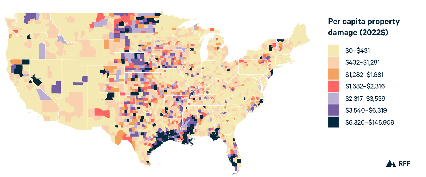 For example, some counties in North Dakota rank in the top 48th percentile in total damage on average but rise to the top 17th percentile on a per capita basis. Iowa, Kansas, and Nebraska have similar patterns. In these states, the financial and social consequences of disasters can be quite high for individuals, even though the total damage from extreme weather events do not stand out nationally. Across all counties, the average amount of property damage per capita from 1995 to 2022 was $1,748, but counties in the top 10th percentile experienced average damage of $11,515 per capita.