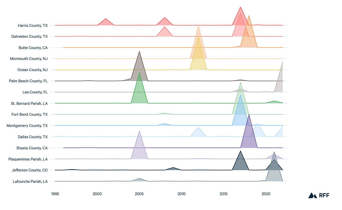 A single event accounts for the lion’s share of the damage in most of the counties in the top 15 (much like in the case of the Camp Fire and Carr Fire). In the two New Jersey counties in the top 15, Monmouth County and Ocean County, Hurricane Sandy (which occurred in 2012) accounts for 99.2 percent of the total damage from 1995 to 2022 in those counties. Single events loom large even in counties that experienced multiple events; for example, Hurricane Katrina for the parishes in Louisiana that are in the top 15, and Hurricane Ian for Palm Beach County, Florida (Figure 3).