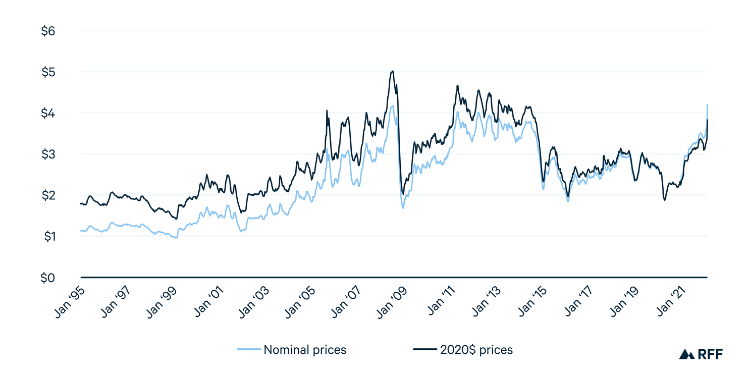 Figure 1. Average Weekly US Nationwide Gasoline Prices in Nominal and Inflation-Adjusted Terms ($/gallon)