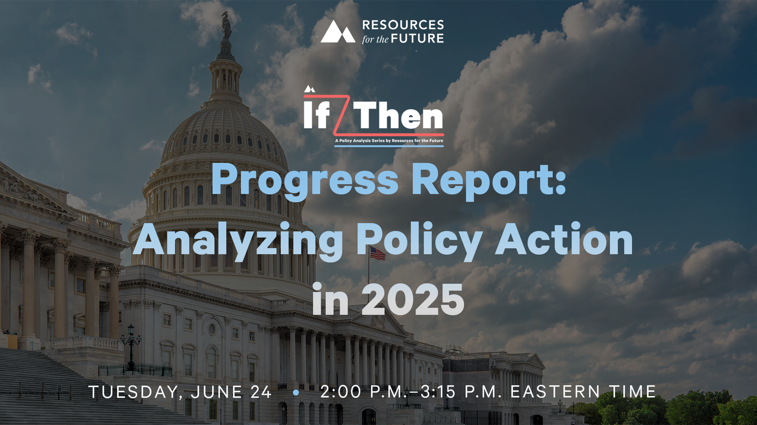 The event took place as a webinar that was hosted by RFF with moderator Anna Kramer, an energy and environmental policy reporter at NOTUS, leading RFF researchers in a discussion about some of the topics that the If/Then series has covered, particularly in the context of the budget reconciliation bill that was deliberated in the US House of Representatives and the Senate earlier this year, with the House and Senate versions of the bill reconciled at the start of the summer, and the final bill signed into law on the Fourth of July by President Donald Trump. We held the event at around the 100-day mark of the new Trump administration.