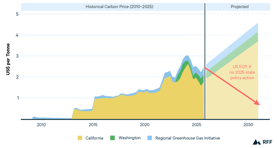 Figure 1 shows each of the three markets’ contributions to the historical increase in the US carbon price over the past 15 years. At the end of 2024 and beginning of 2025, subnational carbon markets were rattled by uncertainty arising from federal attacks on state-level climate policy, dithering policy updates, and broad affordability concerns. Without state action, California’s market may have ended after 2030, and carbon prices in the other two markets could have continued on lower price paths (see the red dashed line).