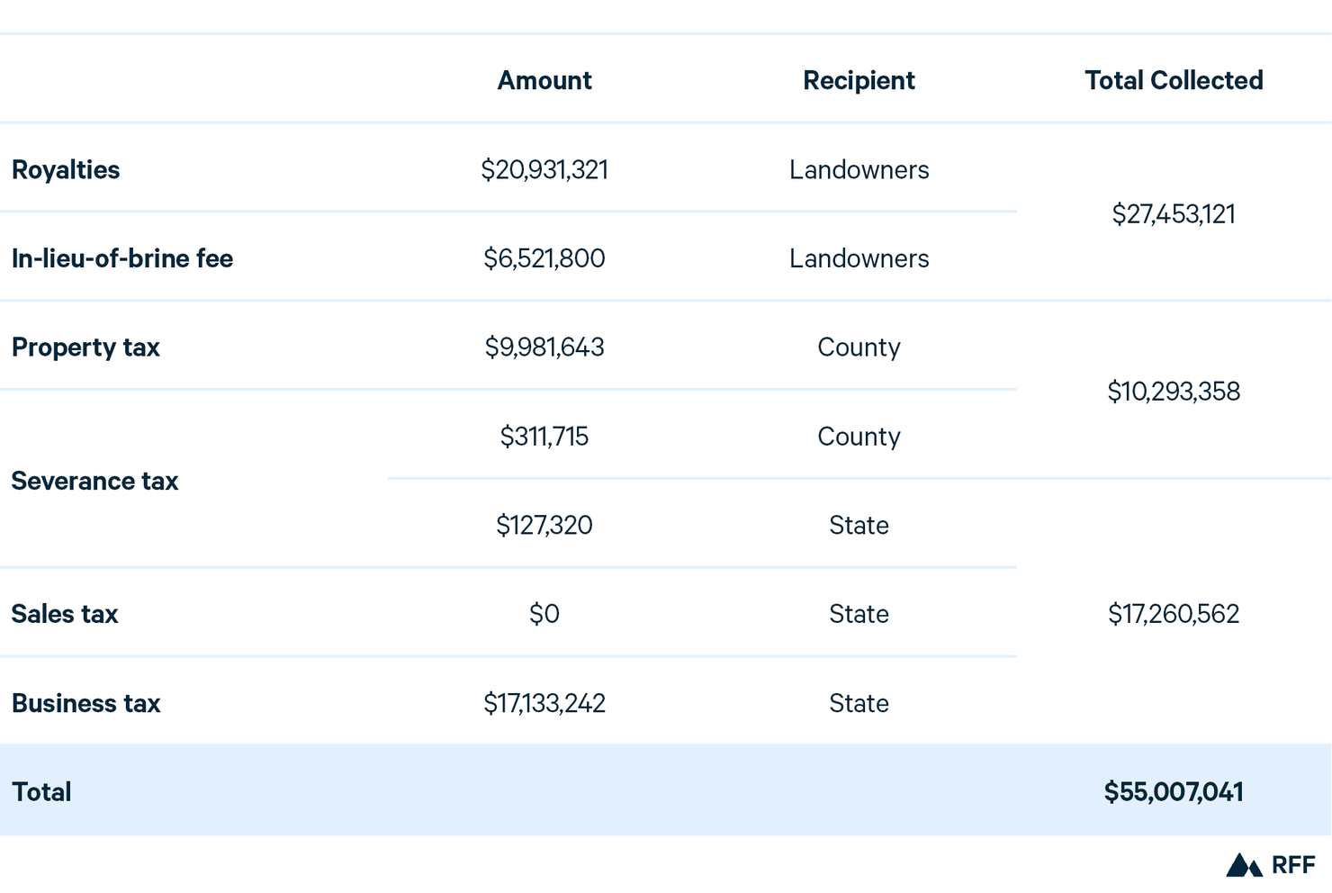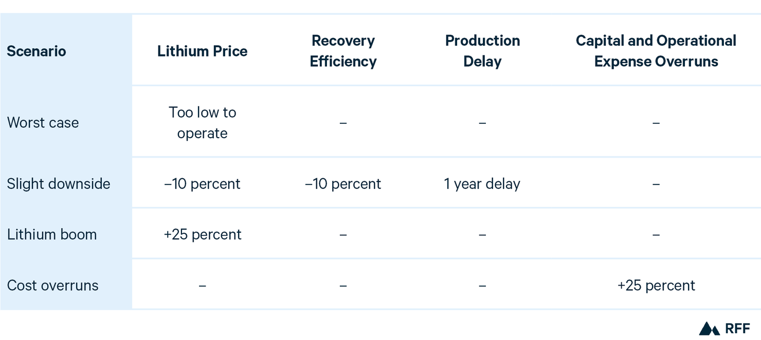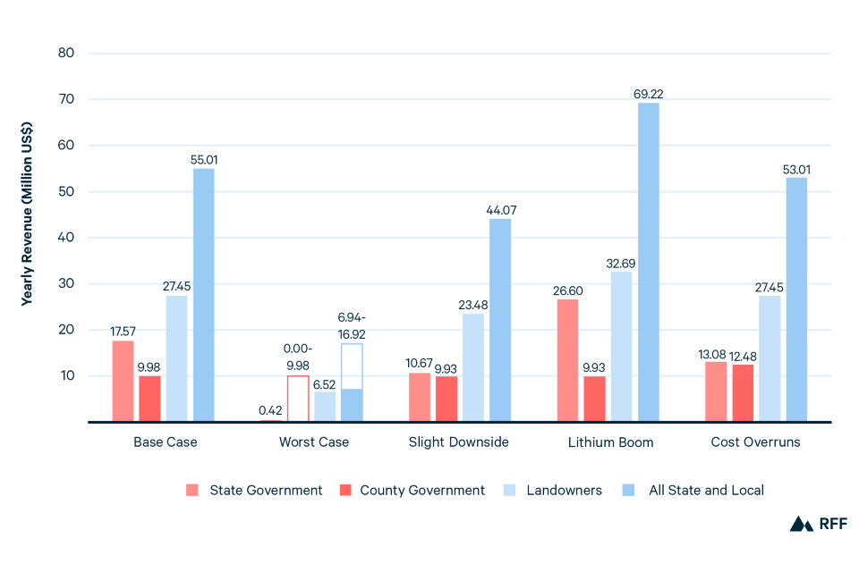 In the lithium-boom scenario, realized lithium prices are 25 percent higher than expected, perhaps because of a favorable purchase contract or due to global changes in supply and demand. In this case, company revenues go up, increasing how much the companies need to pay to landowners and government; however, property taxes and in-lieu-of-brine fees remain the same.