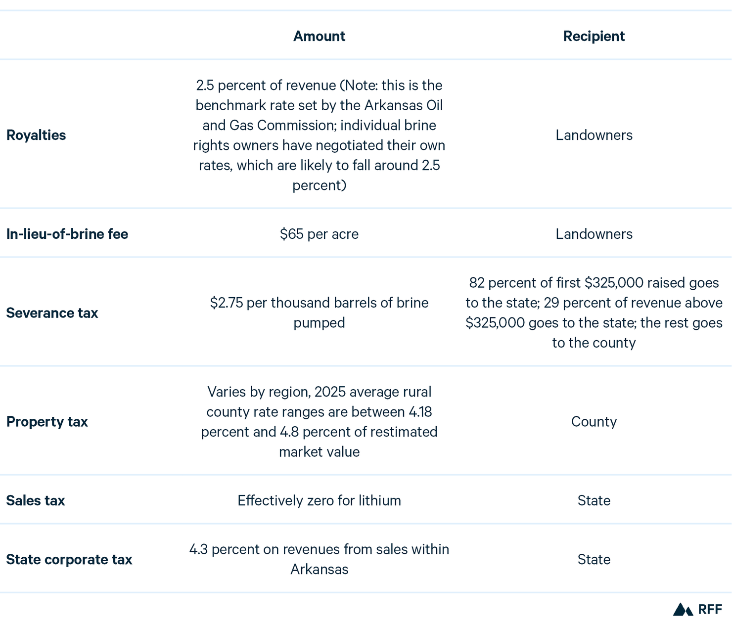 The amount of taxes and royalties collected from the lithium industry in southwest Arkansas would depend on factors including the tax and royalty rates imposed on the industry, company profits, and volumes of production. Importantly, the extent to which DLE could provide a robust and extended tax resource base will depend on how the industry performs.