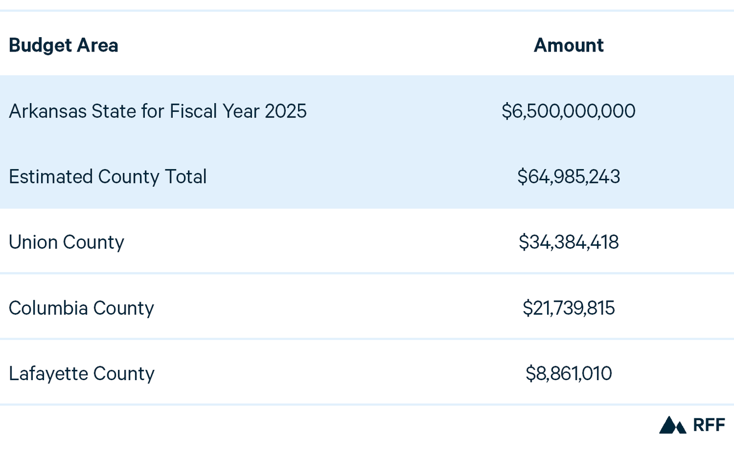 To answer these questions, we conducted an analysis to demonstrate the range of funds that could be collected at the local, county, and state level, given a variety of uncertainties related to DLE technology. Using a project finance model developed in-house, and with data taken from publicly available feasibility and project studies from four companies aiming to invest in DLE operations in the region, we find that Lafayette, Union, and Columbia Counties in southwest Arkansas could expand their yearly budgets by around 15 percent, though that amount could drop to zero under unfavorable conditions. However, the real winners are the landowners, taking home almost double what a county acquires from DLE.
